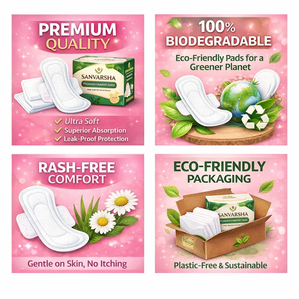 Soft on Skin, Strong on Protection. At Sanvarsha, we’ve reimagined feminine hygiene for the modern woman. Our premium sanitary pads offer the perfect blend of ultra-soft comfort and high-performance absorption. Because your period shouldn’t stop you—it should empower you.